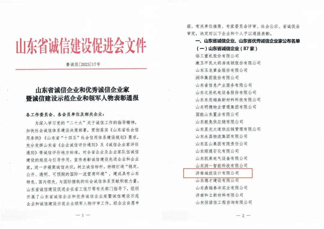 多年來,濟(jì)南城投設(shè)計(jì)有限公司以“為生態(tài)更文明,讓生活更美好”為企業(yè)使命,積極踐行“知行合一,為人民服務(wù)”的企業(yè)核心價(jià)值觀……將誠信品質(zhì)深深融入到公司的企業(yè)文化和生產(chǎn)經(jīng)營中,塑造了良好的企業(yè)形象,樹立了良好的社會(huì)聲譽(yù)。